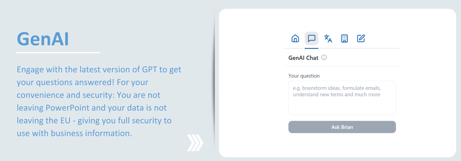 Make your PowerPoint work smarter with four Brian skills! Use GenAI, slide translation, company analysis, and a text assistant all within your slides.